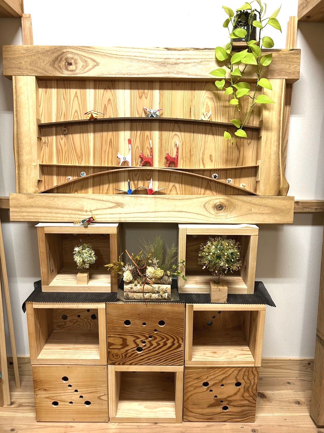 狭いながらも杉・桧を使った展示室を作りました。板1枚見てもイメージが湧かないのが当然です。見やすいようにしたつもりです。