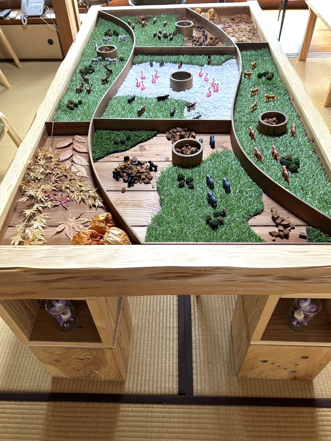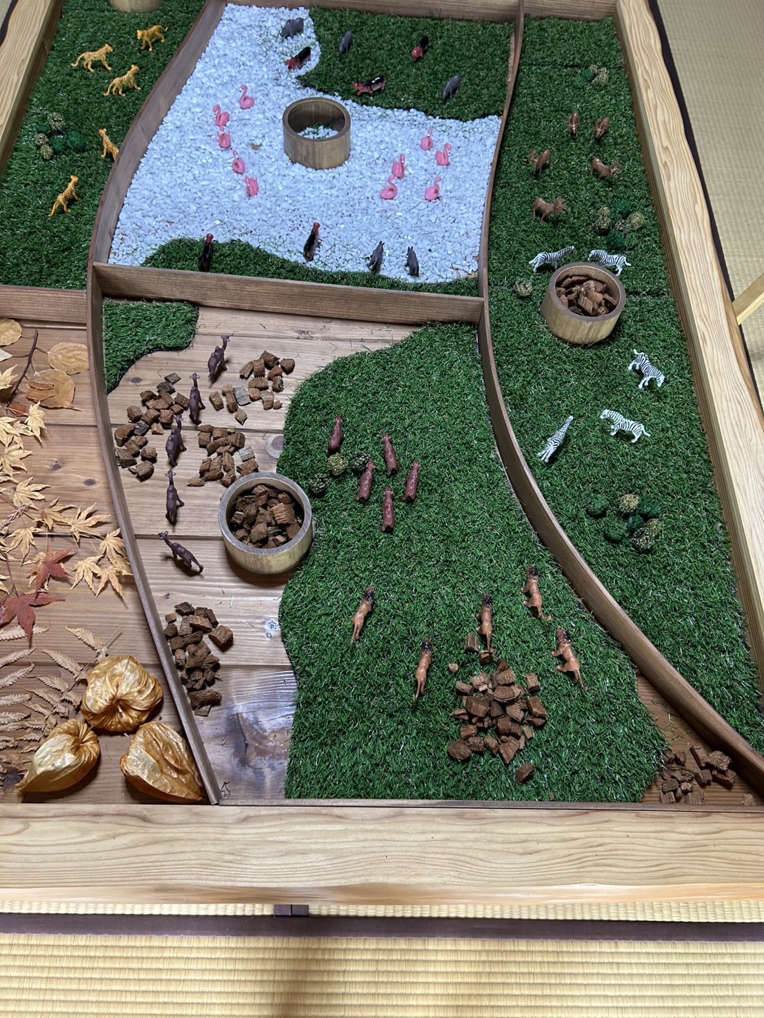 このテーブルの中には動物を入れてみました、細い板で間仕切りをして、サファリゾーンをイメージしてたまに作り変えたりしています。